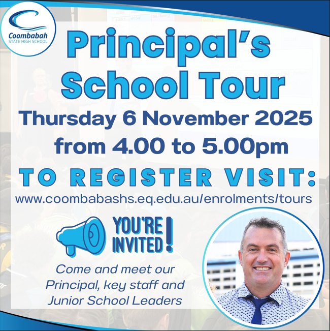 Join us for our next Principal’s Tour on Thursday, November 6 from 4–5pm.Come and meet our Principal, key staff, and junior school leaders, and see what makes Coombabah SHS a supportive and dynamic place for students to learn and grow.